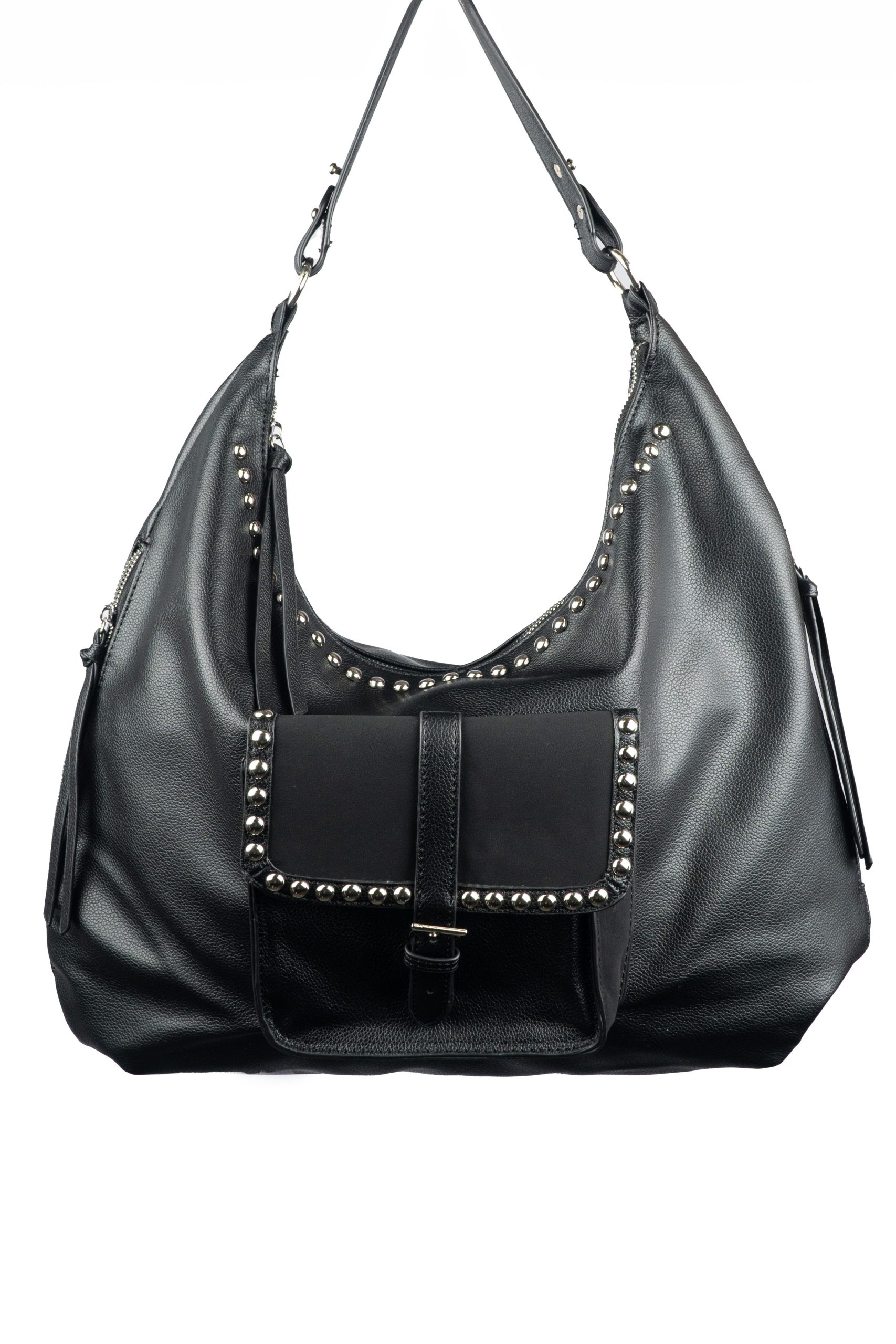 Bolso grande, con compartimientos y acabados en color plata.
