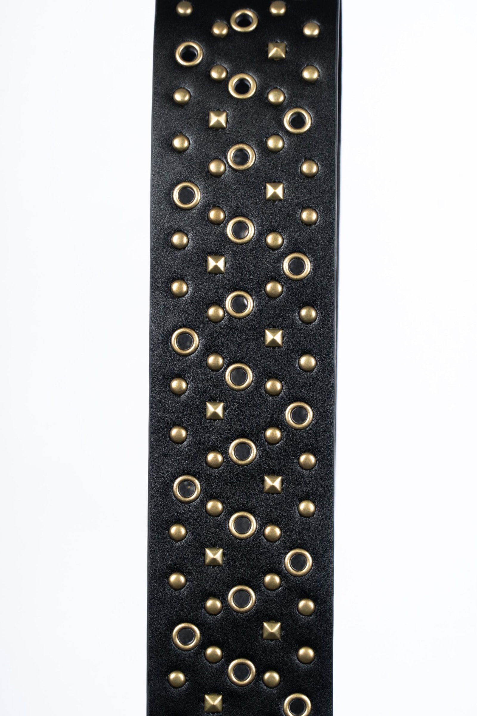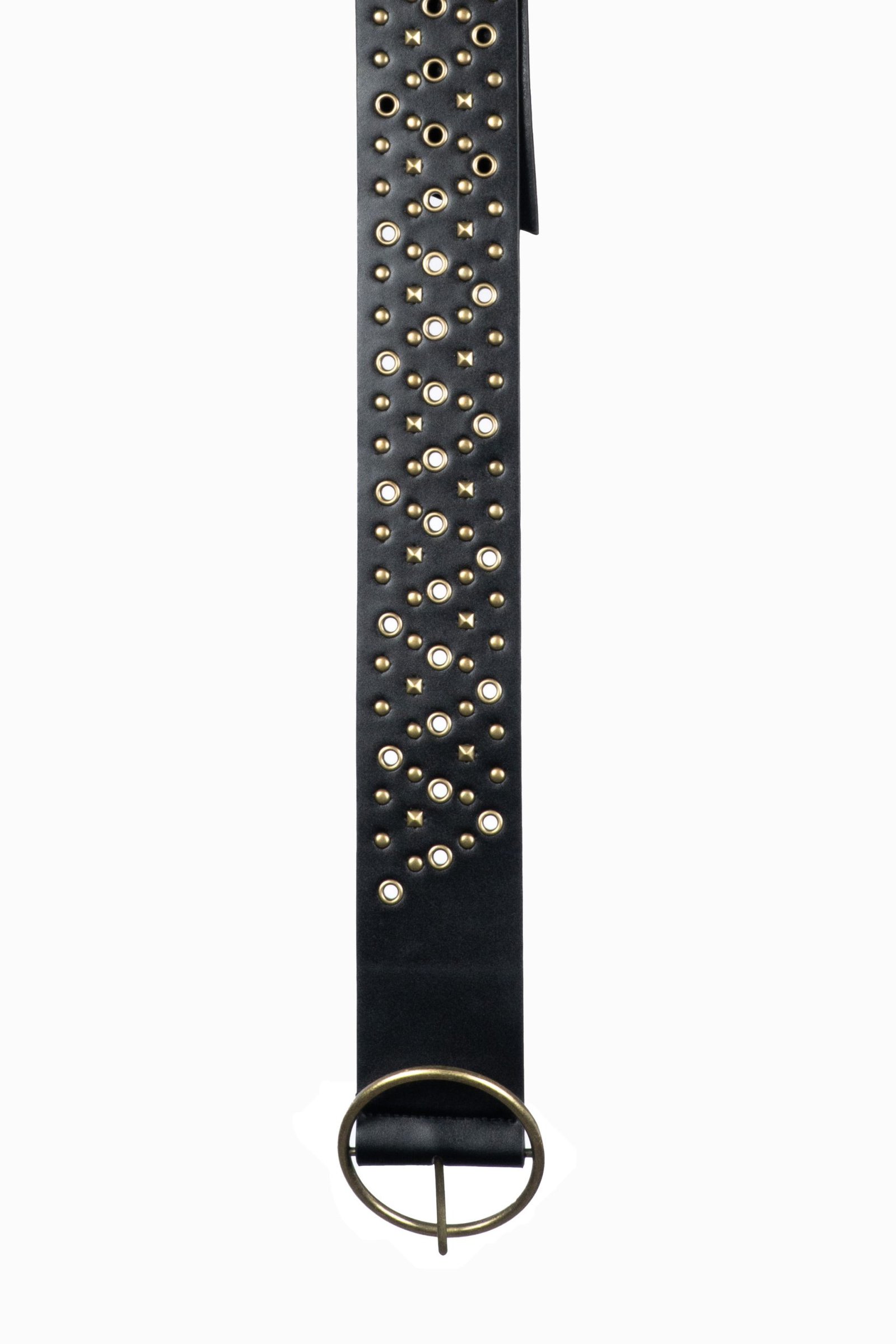 Cinturón de semi-piel en color negro con tachuelas en colores metálicos y cierre de hebilla.