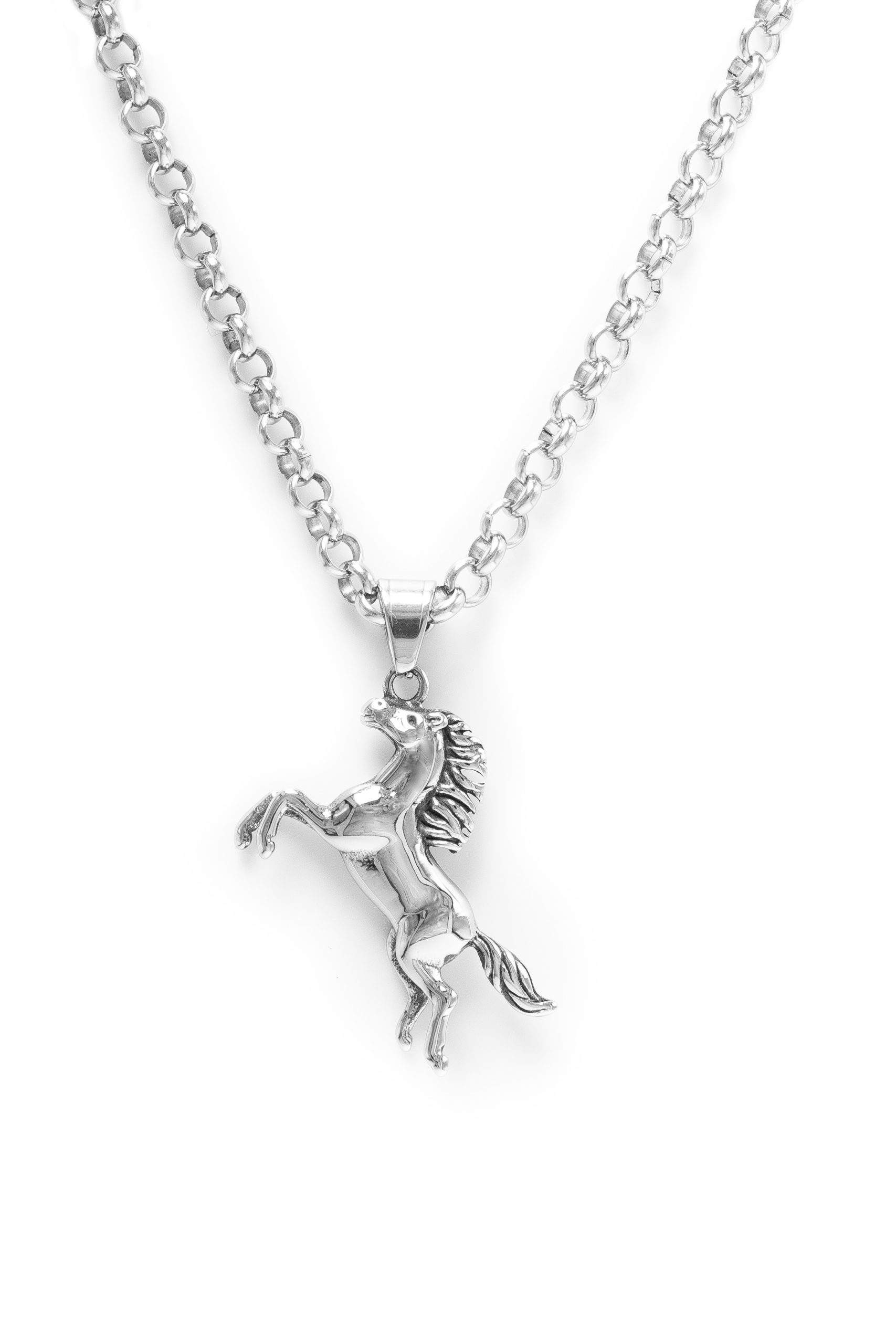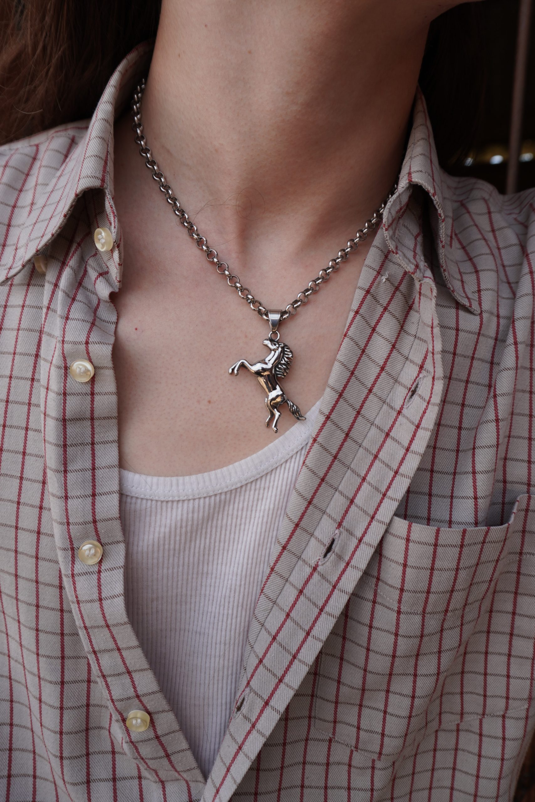 Collar que presenta diseño de un caballo con cadena regulable en color plata.