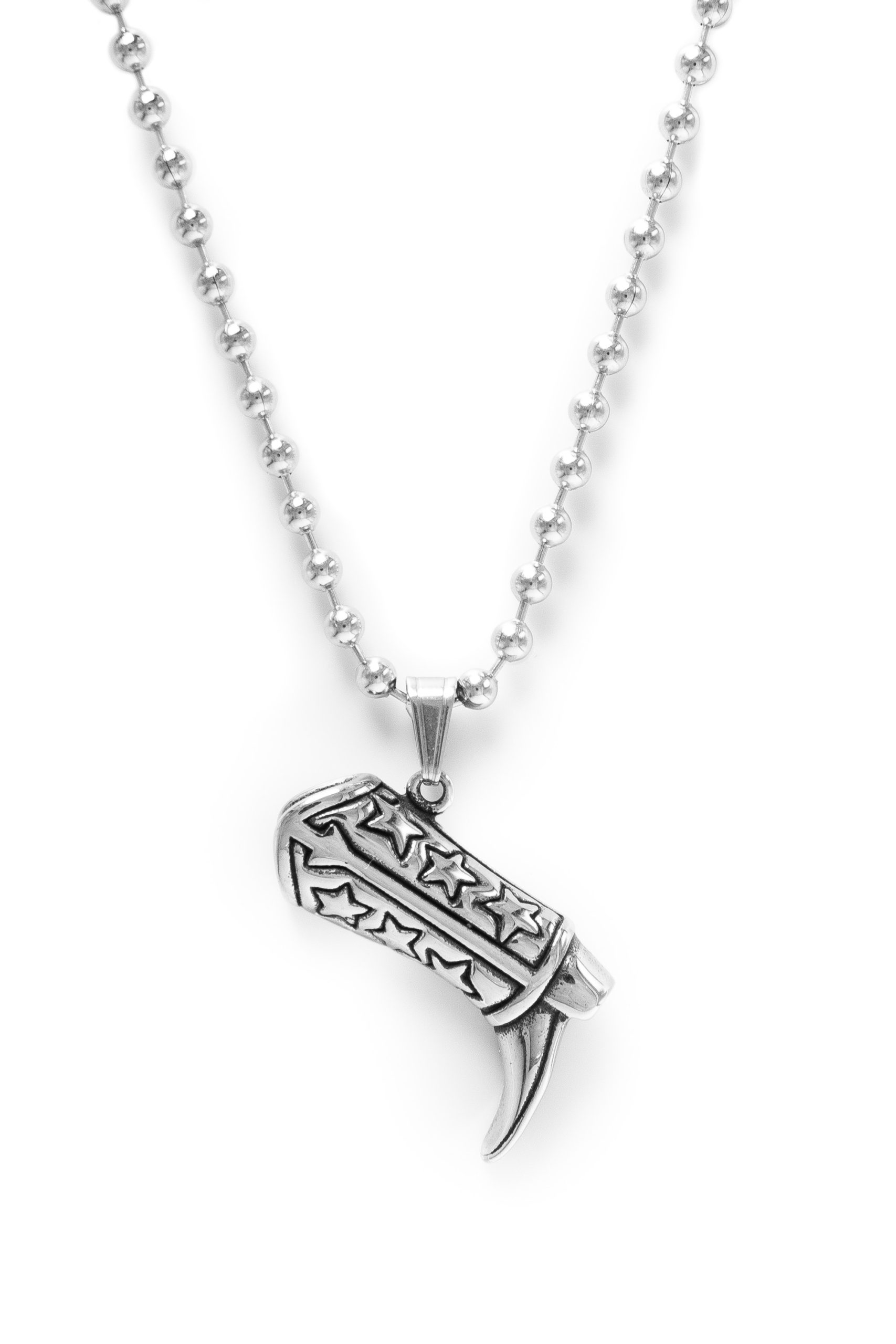 Collar que presenta diseño de una bota cowboy con estrellas en color plata